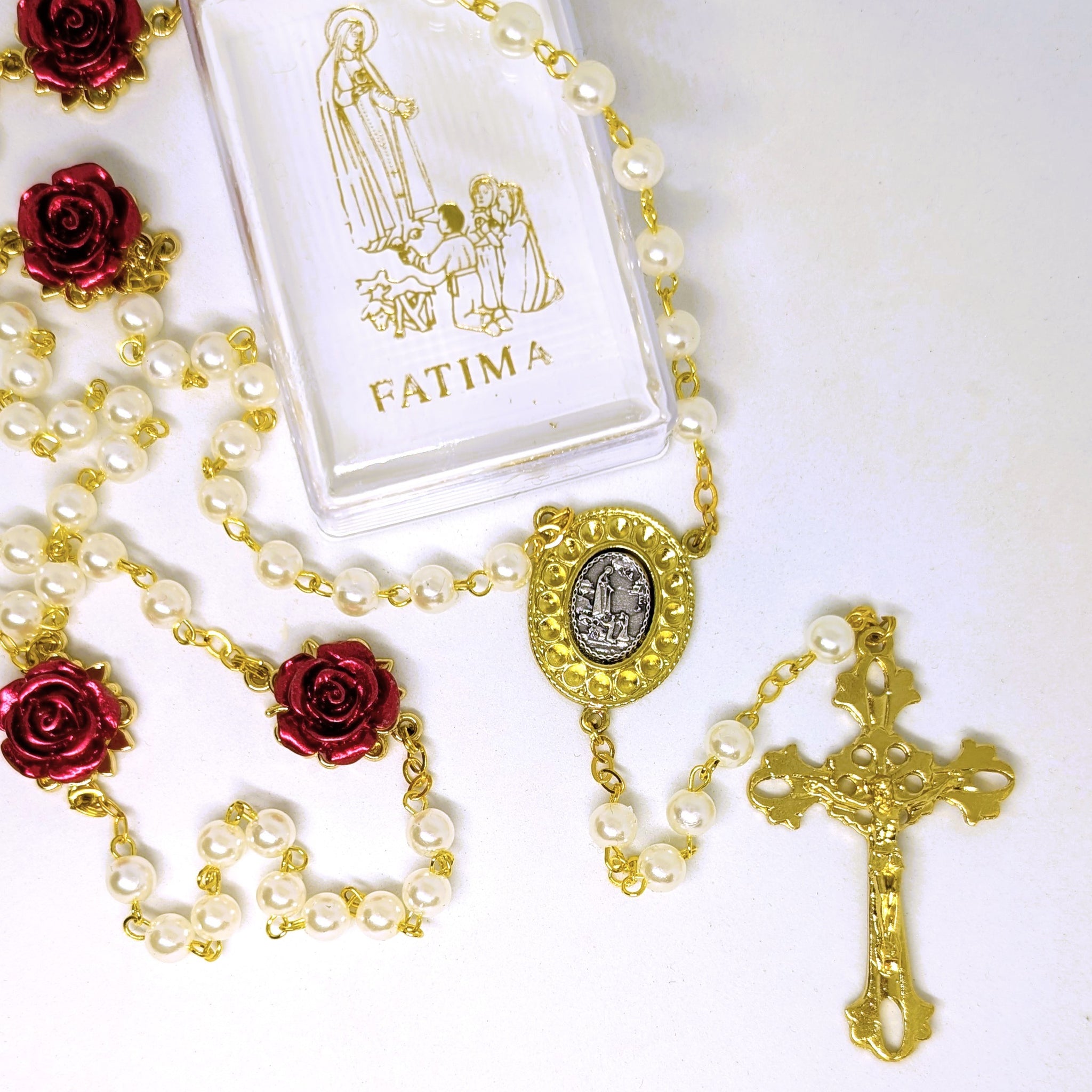 The Roses of Fatima Rosary is a stunning and delicate devotional piece that combines classic elegance with floral symbolism. This rosary features shimmering white pearl beads, while the "Our Father" beads are uniquely represented by detailed red roses. The centerpiece is a silver-toned medal depicting the Apparitions of Our Lady of Fatima to the three shepherd children. Completing the design is a beautiful, hand-worked golden cross, providing a sophisticated contrast to the pearls. This rosary is as much a piece of art as it is a powerful tool for prayer.